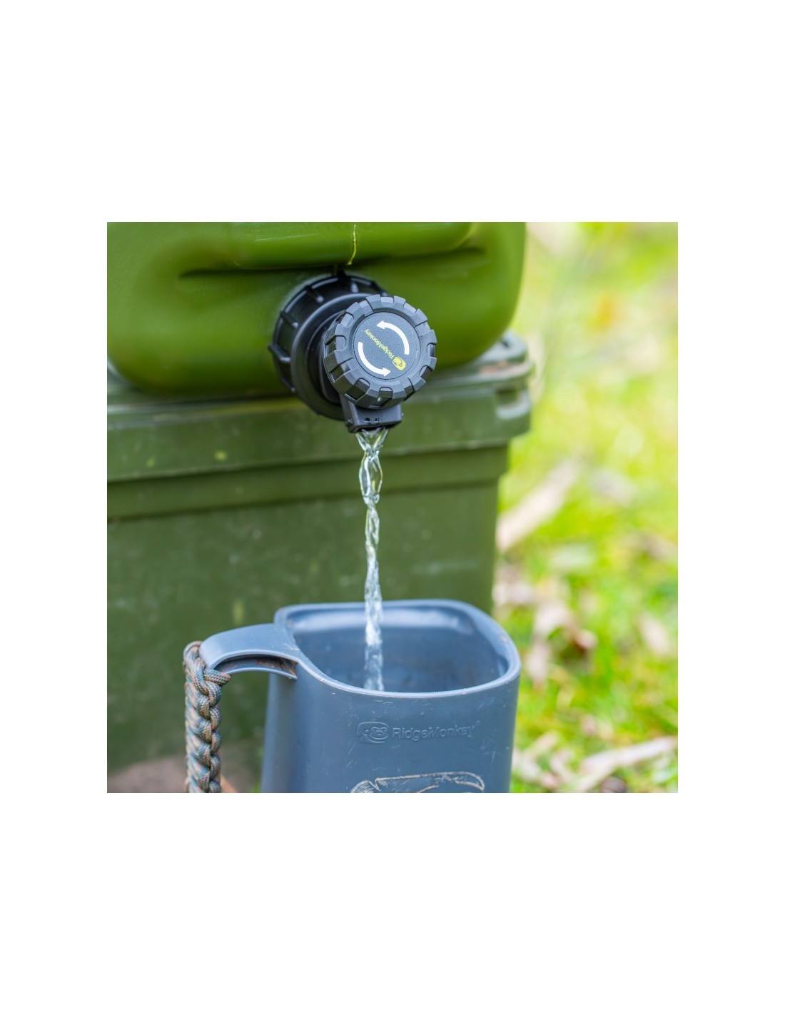 La segunda tapa del Portabebés RidgeMonkey Heavy Duty se puede sustituir por un grifo. Esto te permite poner el RidgeMonkey de lado, preferiblemente elevado sobre una mesa de vivac, encima de tu hervidor, taza o cacerola - haciendo que llenar tu equipo de cocina sea increíblemente fácil. En lugar de tener que levantar tu botella de agua llena para verter el agua, puedes simplemente abrir el grifo y dejar que el agua se vierta directamente en el recipiente que estás tratando de llenar.